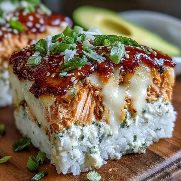 Pin it My friend texted me a video link with the words try this NOW and honestly, I almost ignored it. But something about the bubbling cheese and pink salmon pulled me in, and by that evening I was at the grocery store buying sushi rice and way too much sriracha. The first time I pulled this out of the oven, my kitchen smelled like a sushi restaurant had moved in, and I understood why the internet couldn't stop talking about it. It's messy, it's indulgent, and it's the kind of dish that makes everyone lean over the pan with a spoon before you've even plated it.